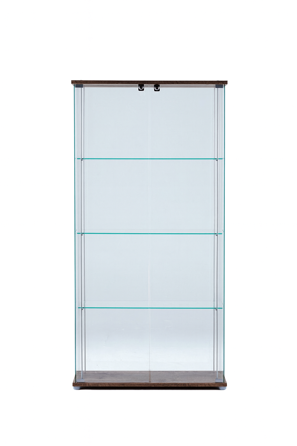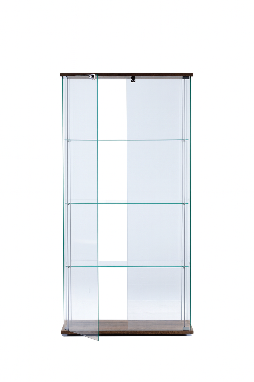 Witryna wyposażona jest w 3 półki wykonane z hartowanego szkła, które cechuje się wysoką odpornością na uszkodzenia oraz dużą nośnością. Idealnie nadaje się do prezentowania szklanych naczyń, kolekcjonerskich figurek, książek czy roślin. Szklane półki podkreślają nowoczesny charakter mebla i gwarantują bezpieczeństwo przechowywanych przedmiotów.