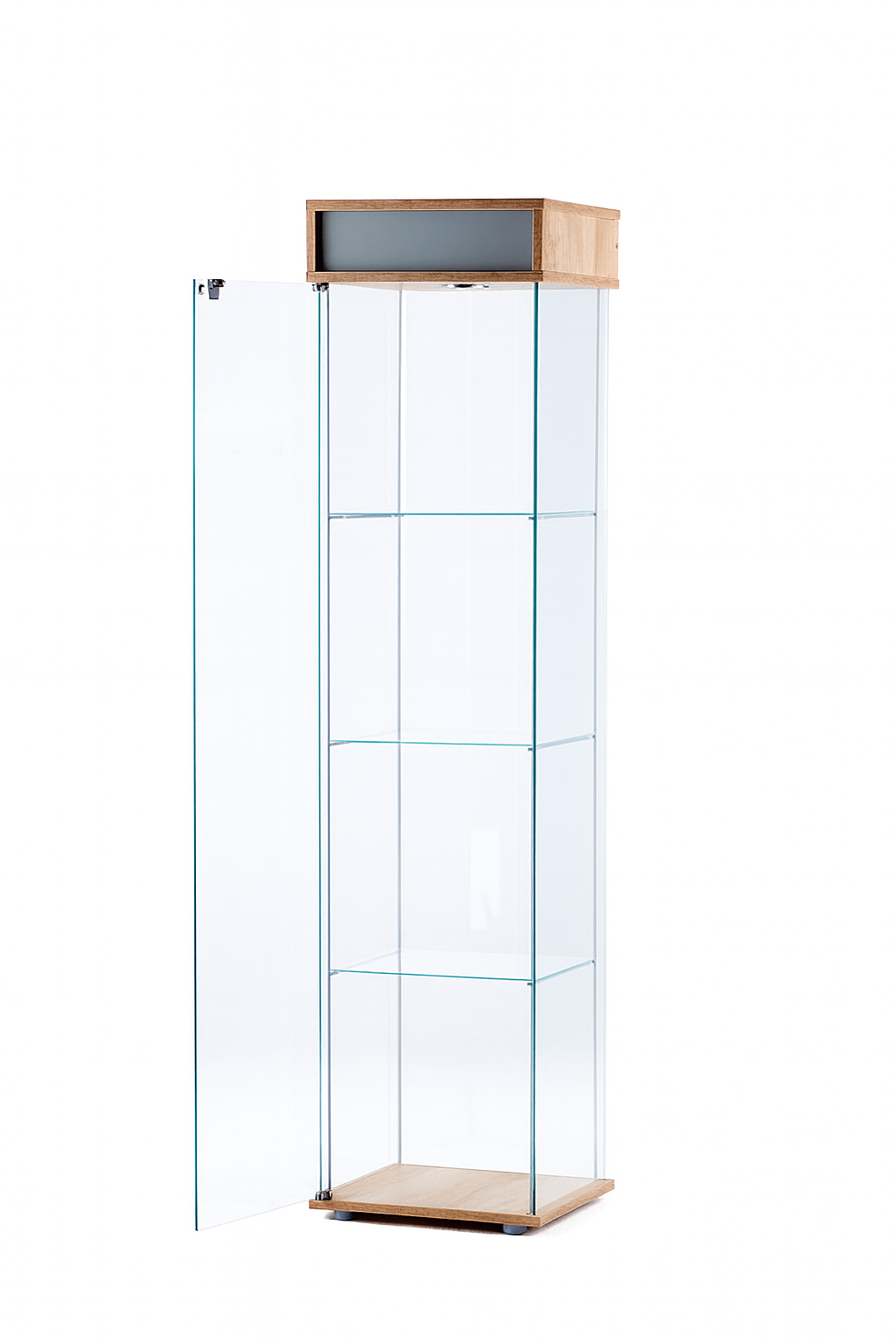 Wewnątrz znajdują się trzy półki z bezpiecznego hartowanego szkła, które są odporne na uszkodzenia i doskonale eksponują przedmioty. Idealne do prezentacji ozdób, kolekcji, ceramiki, kosmetyków, trofeów lub innych wartościowych elementów.
